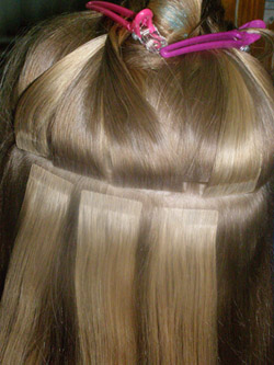 К вашим волосам с помощью смолы, микроскопических металлических колечек или клея крепятся длинные волосы.
