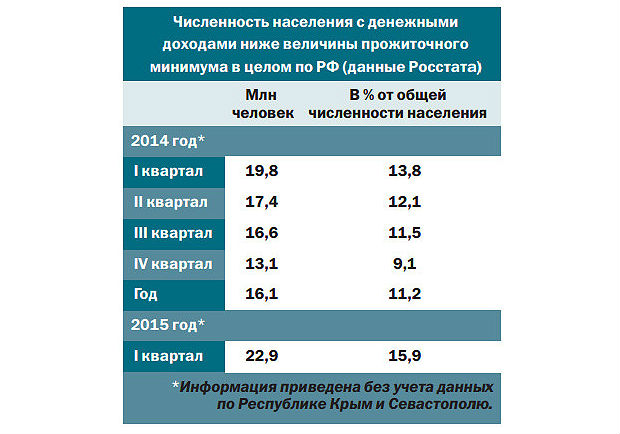 Бедных россиян в стране все больше. Об этом свидетельствуют представленные на нынешней неделе данные Росстата. В первом квартале до 22,9 млн человек выросла численность граждан с денежными доходами ниже официального прожиточного минимума. Этот прожиточный, заметим, даже в условиях жесточайшей экономии семейного бюджета едва ли позволяет сводить концы с концами: 9662 рубля в среднем по стране на одного человека в январе — марте. Можно бы сказать, смешные деньги, но здесь не до шуток.