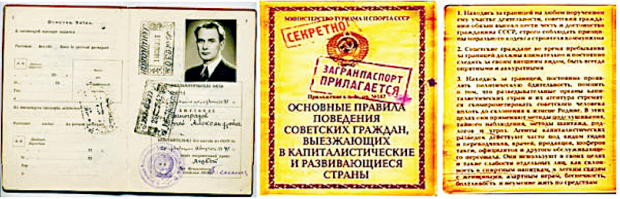 Загранпаспорт с проставленными визами советский гражданин получал в аэропорту. На внутренней обложке документа под грифом «Секретно!» была специальная памятка (на фото справа): как себя вести и как противостоять действиям западной разведки. Совсем по Высоцкому: «Говорил со мной, как с братом, про коварный зарубеж, // Про поездку к демократам в польский город Будапешт: // «Там у них уклад особый, нам так сразу не понять, // Ты уж их, браток, попробуй хоть немного уважать. // Будут с водкою дебаты, отвечай: // Нет, ребята-демократы, только чай. // От подарков их сурово отвернись, // Мол, у самих добра такого завались».