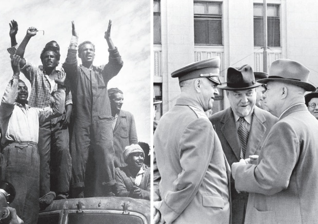 Строители Асуанской ГЭС (фото слева). Была такая песня: «Напиши мне, мама, в Египет, как там Волга моя живет». Она о наших ребятах-гидростроителях, зажигавших лампочки в далеких странах. А этому снимку справа 70 лет. 1956 год. Три фигуры, ворочавшие миллионами судеб: министр обороны маршал Жуков, председатель Совета министров СССР Булганин, первый секретарь ЦК КПСС Хрущев. Каждый из них стал жертвой дворцовых интриг. Фото Н.М. Привалова, газета «Труд»