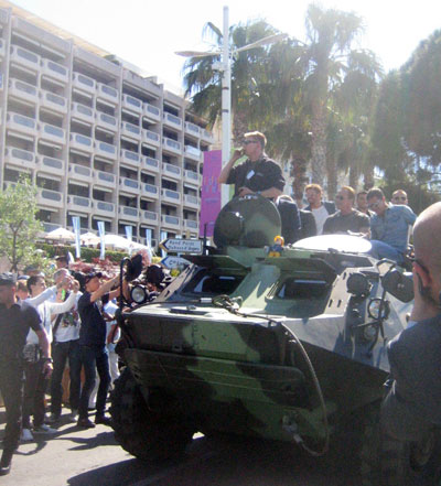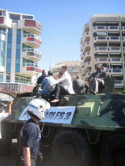 Первая мысль — даже не о войне, а об очередной забастовке, которые тут, пользуясь вниманием мировой прессы к Каннам, устраивают в дни фестиваля то пожарные, то таксисты. Но все оказывается проще: парад бронированных машин организован по случаю презентации нового фильма Сильвестра Сталлоне, «Неудержимые-3». Сталлоне приехал в Канны вместе с коллегами Харрисоном Фордом, Мэлом Гибсоном, Джейсоном Стэтхемом и Антонио Бандерасом. На бэтээрах вся эта компания «неудержимых» смотрелась очень внушительно. А шанс прокатиться в эскорте на военных джипах получили вполне штатские ребята в дорогих костюмах и девушки в вечерних платьях. Но подобный креатив промоутеров — скорее исключение. Наиболее популярным местом для демонстрации платьев и смокингов остается красная дорожка фестивального дворца.