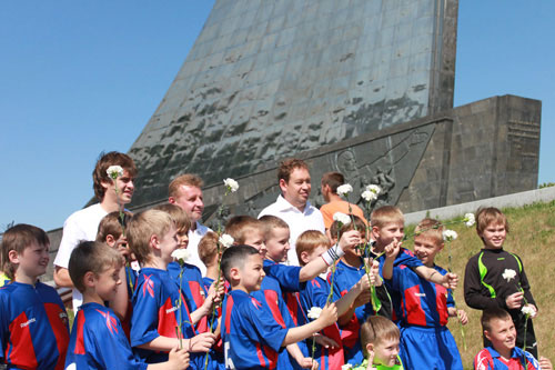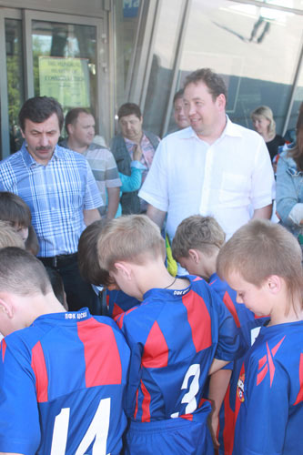 Леонид Слуцкий и защитник ЦСКА Георгий Щенников вместе с юными воспитанниками знаменитой армейской футбольной школы.