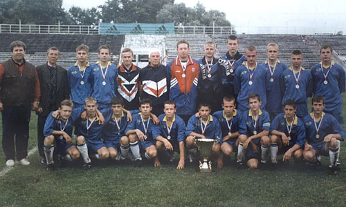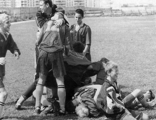 Фото из архива ДФЛ: молодой тренер Леонид Слуцкий празднует победу с детской футбольной командой "Олимпия"