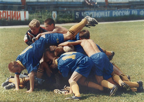 Команда Слуцкого (в центре) празднует очередную победу. Крайний справа - юный Роман Адамов. Второй слева - Виктор Горлов. Денис Колодин куда-то отлучился в момент церемонии.