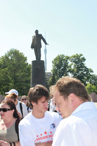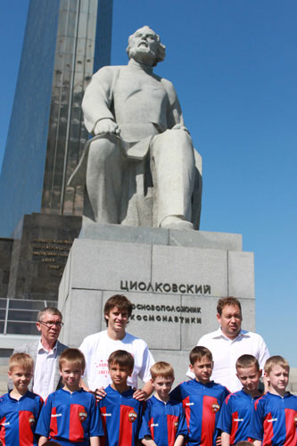 Справо- налево: Слуцкий, Щенников и глава Детской Футбольной Лиги Виктор Горлов у памятника К.Э. Циолковскому. Кстати, Горлов до 2003 возглавлял отдел спорта в нашей газете.