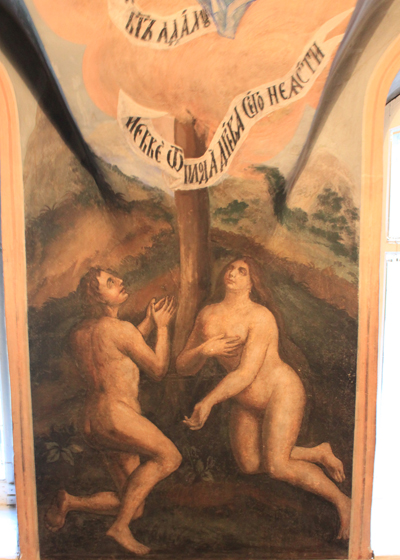 Вся история грехопадения Адама и Евы изображена в виде комиксов, и основатели рода человеческого нарисованы совсем голыми, с полным комплектом всех физиологических компонентов. На некоторых картинках потом поверх половых органов пририсовали узкие кусочки материи (срамные пояски), а на других и этого делать не стали. Причем пояски отмыли при советской власти, столь заботившейся о нравственном воспитании молодежи. А в царское время такие вольности объясняются отчасти тем, что храм никогда не имел функций постоянного прихода для верующих масс, а работал он лишь три раза в год: день рождения Дмитрия, день смерти и день канонизации.