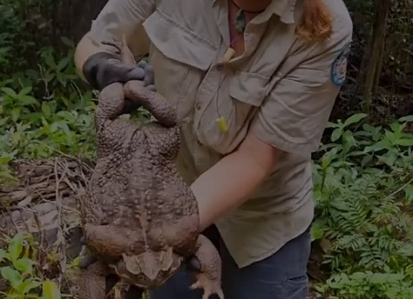 Обнаруженная тростниковая жаба, пойманная сотрудниками парка, оказалась в длину более четверти метра, ее вес составил 2,7 килограмма. И ей даже решили дать имя - Toadzilla (Жабзилла).