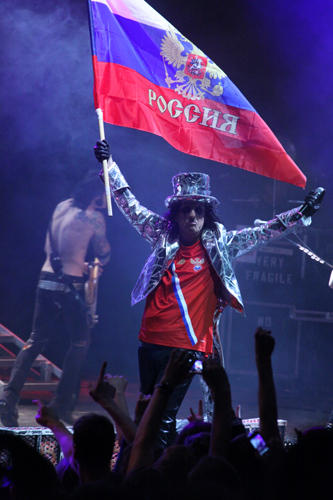 Вообще в программе решительно преобладали старые вещи вроде «Poison» или «Hey Stupid». Лишь иногда и очень осторожно Элис разбавлял их новинками. Так, после первого перерыва, во время которого команда играла интро, похожее на старую пластинку с заевшим началом 40-й симфонии Моцарта, Элис под мощную канонаду ударной установки вернулся в куртке с крупной надписью «Новая песня», а под ней оказалась белая рубашка с выведенным красной краской названием " I’ll Bite Your Face Off». Еще пара быстряков, где Купер продемонстрировал свое владение пронзительным фальцетом, — и резким контрастом на затемненной сцене затянула свое виртуозное соло гитаристка Орианти Панагирис: та самая, которую хотел взять в свое последнее шоу «This Is It» Майкл Джексон. Прямым продолжением этого номера стала нежнейшая и красивейшая баллада «Only Women Bleed», во время которой Элис качал на руках кукольную девушку натуральной величины с шевелюрой, демонстративно похожей на белые локоны Орианти. Правда, в следующей песне от нежности не осталось следа, певец злобно истрепал несчастное чучело и выбросил его. После этого, по законам шоу Купера, череда его злодеяний пошла по нарастающей. В «Feet My Frankenstein» певец вырядился в сумасбродного профессора — надел белый халат в подозрительных красных пятнах и при помощи агрегата, похожего на советский автомат с газированной водой, выпустил на свет божий огромную, в два человеческих роста куклу Франкенштейна. Назойливого папарацци (надеемся, статиста, а не реального фотографа) проткнул мечом. Врученный ему букет роз цвета венозной крови растерзал на лепестки и бросил веником обратно в публику. Наконец сам попал в лапы палачей, похожих на полуистлевших покойников, и наступила кульминация, которой обычно так ждут завсегдатаи Куперовых шоу: отрубание Элису головы на гильотине. Под заунывную гитарную мелодию голову отрубили, палач показал муляж публике (к тому моменту, кажется, большая часть зрителей в восторге привалилась к сцене, так что сотни могли потрогать кудлатую башку с трупными разводами), четверка гитаристов сыграла и спела сокрушительный по полифонической мощи номер «I Love The Dead», но тут как ни в чем не бывало явился живой Элис в цилиндре а-ля дядя Сэм и в своей весело-ядовитой манере исполнил «School’s Out». Свет пригас, вышли техники, поднимая поверженные микрофоны, народ зароптал — как, уже все? Но не таков Купер, чтобы покинуть публику по-английски. Он сделал это с американским пафосом — неожиданно выскочил на сцену с российским флагом в руках. Вот тут уже никто не сомневался и не обижался: это настоящий финал программы.