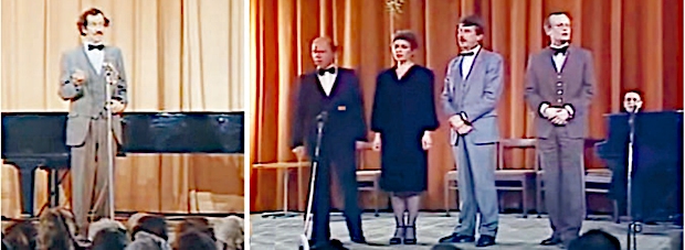 Понятно, что народ буквально рвался на эти капустники: в обычном театре такой крамолы не услышишь. Причем подкупали не только смелость, но и стиль: острота без жестокости, юмор без пошлости. Кстати, не все знают, что выражение «рояль в кустах» родилось тоже на капустнике, а точнее, на выступлении вот этого капустного дуэта. Это была пародия на якобы прямые телеэфиры. Репортер останавливает на улице случайного прохожего («Как вас зовут? — Вы мне? (перепуганно). — Вам, Серегин (шепотом), вам».) и интересуется его увлечениями. И выясняется, что пенсионер и на скрипке не прочь сыграть (и играет!), и на пианино может, вон и рояль у него тут, в кустах...