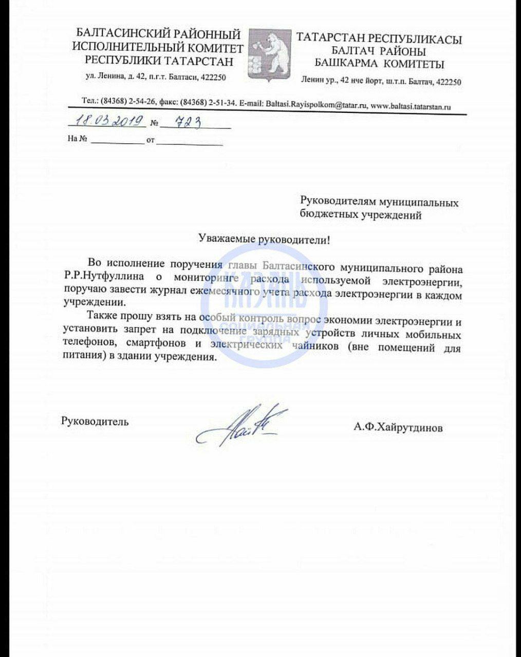 Власти Балтасинского района Татарстана запретили врачам и учителям заряжать на рабочих местах личную мобильную технику, а также пользоваться электрическими чайниками. Соответствующее распоряжение было подписано руководителем исполкома района Айдаром Хайрутдиновым.