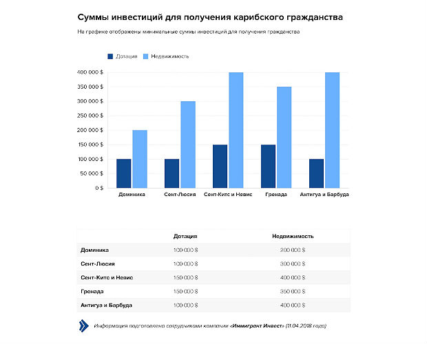 Такой вариант хотя и является достаточно затратным, выглядит привлекательнее традиционного способа — инвестиций в Фонд диверсификации сахарной промышленности, размер которых составляет $250 тысяч. Этот способ предусматривает также доплату в размере 50 тысяч долларов США за участие в программе супруга или супруги, и еще по 25 тысяч — за каждого следующего члена семьи.