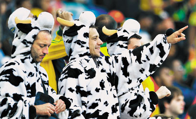 Корова — это символ Каталонии. Поэтому многие болельщики «Барселоны», которые на мундиале, естественно, поддерживают сборную Испании, на чемпионат мира в ЮАР прибыли в нарядах, напоминающих именно этих животных.