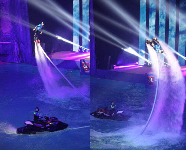Прекрасно показали себя также юные представители художественной гимнастики, выступавшие на высоком помосте за бассейном. Ну а настоящий фурор произвел мастер флайборда. И хотя я раньше слышал такое слово, но когда парень в гидрокостюме начал летать над 50-метровым бассейном «Олимпийский», я не сразу понял — что происходит и в чем тут дело. В итоге, если я правильно разобрался в столь сложном техническом устройстве, дело обстоит так: миниатюрный, но мощный катер нагнетает струю в шланг, который тянется до мини-платформы, к которой привязан спортсмен. И под действием водяной реактивной струи спортсмен не только преодолевает силу земного притяжения, но летает над бассейном, словно очень маневренный планер.