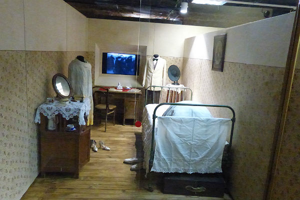 В следующей квартире присутствует мебель в стиле модерн. Кресла такой приятной наружности и декора, что я б их с удовольствием поставила у себя дома. Понимая ценность предметов выставки, все же хочу отметить, что эти кресла в обоях того периода будут смотреться гораздо лучше, чем в фанерных кубах, стилизованных под квартиры разных временных периодов. Далее мое внимание обратили на себя предметы с агитационной символикой в интерьерах 30-х годов, когда Ленин был обязан висеть над каждой кроватью. Там есть и редкие агитационные чайные пары, и кувшин, выпущенный к открытию Сельскохозяйственной выставки.