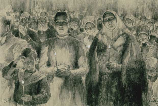 Л. О. Пастернак. Иллюстрации к роману Л. Н. Толстого «Воскресение». Катюша у пасхальной заутрени. 1898-1899 гг.