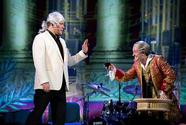 В паре моментов программа вышла за рамки собственно музыкального искусства. Первый раз это случилось, когда на сцену в париках явились… гигантского роста Моцарт и смотрящий на него снизу вверх Сальери: Денис Мацуев и Сергей Безруков. Свой «сальеризм» Безруков объяснил завистью со стороны того, кто на свое 35-летие смог собрать «только» БКЗ «Октябрьский» в Санкт-Петербурге, а это раза в три поменьше Кремлевского дворца. Повторяя пушкинский сюжет, усадил приятеля за рояль и стал искушать выпивкой. Стойкий Денис отказывался от всех тостов, даже за музыку и любовь: дескать, сглазишь. Не смог устоять только против одного – «за Байкал!» и жахнул-таки заветный бокал «красного».