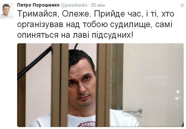 «Äåðæèñü, Îëåã. Ïðèäåò âðåìÿ, è òå, êòî îðãàíèçîâàë ñóäèëèùå íàä òîáîé, ñàìè îêàæóòñÿ íà ñêàìüå ïîäñóäèìûõ!» - íàïèñàë óêðàèíñêèé ëèäåð â ñâîåì ìèêðîáëîãå â Twitter.