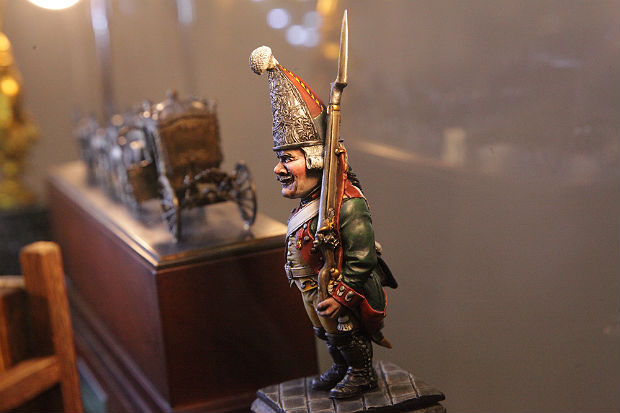 Все эти миниатюры — штучные изделия. Точнее, серийные, но серии крайне малы. Ведь в основе олово, формочка для которого выдерживает не больше 150 отливок, дальше надо изготавливать новую. Да и то — копиями являются лишь сами «манекены», а их раскраска и одежда абсолютно уникальны. Один из авторов, художник и реконструктор Михаил Преснухин показывает мне суворовского гренадера. Воин как воин, разве что ростом не больше 5 сантиметров. Правда, лицо уж очень знакомое — покорителя Альп художник Олег Панцов наделил улыбкой киноактера Михаила Пуговкина. Без «почему» — просто артист любимый и типаж народный. А чувство юмора, как известно, и на войне никто не отменял.