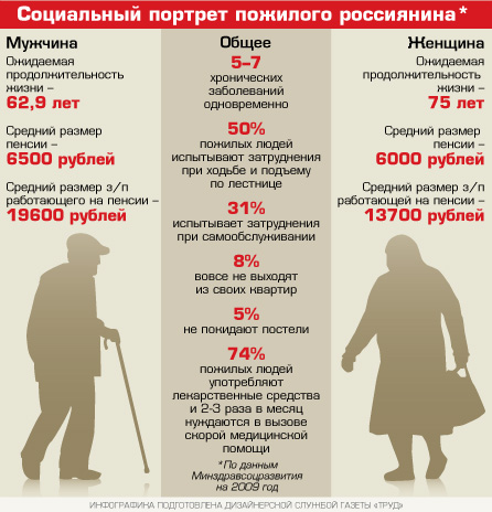 Большая часть пожилых людей проживает в сельской местности и страдает пятью или семью хроническими заболеваниями одновременно. В 2009 году численность мужчин, вышедших на пенсию по возрасту, составляет 8,6 миллиона человек, женщин — 22,1 миллиона человек. Из них в сельской местности проживает 3 миллиона мужчин и 14,2 миллиона женщин. «Таким образом, 64% пенсионеров у нас сегодня проживают на селе», — заметила министр.