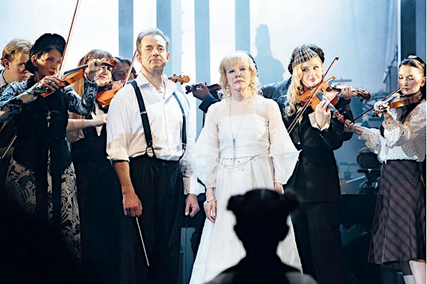 Прямо во время его интервью гаснет свет, и начинается бунт под песню Александра Висты «Оркестр террора». Кто-то стреляет и случайно убивает самую беззащитную в оркестре арфистку Клару (Александра Захарова). Кстати, Александра Марковна когда-то и в самом деле училась играть на арфе для знаменитого спектакля «Безумный день, или Женитьба Фигаро». А ее Клара похожа на блаженную с детской душой. Неслучайно около нее все время вертится пришедшая с режиссером девочка (Василиса Кудрякова), чей напоминающий колокольчик смех — важный звук в спектакле.