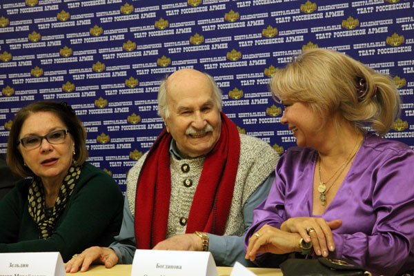В Центральном академическом театре Российской Армии прошел сбор труппы. О своих планах рассказали главный режиссер Борис Морозов, звездные актрисы Людмила Чурсина, Лариса Голубкина и Ольга Богданова, а появление актера-легенды Владимира Зельдина коллеги встретили овацией.