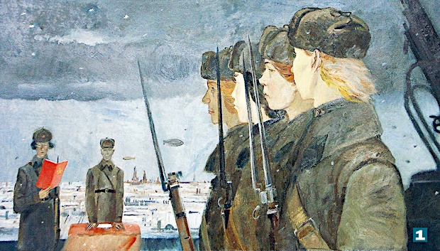 Работал, иллюстрировал книги, участвовал в выставках, но батальную тему не оставлял. Невозможно без волнения смотреть на картины, посвященные зенитчицам Москвы. В основе первой — черно-белая фотография военного фотокора «Правды» Михаила Калашникова. Он снял из окна высокого дома, как внизу, прямо на позиции, девчонки-зенитчицы принимают присягу. А в небе — аэростаты... Ну а к этому наш художник написал крупно портреты девушек. Получился впечатляющий диптих.