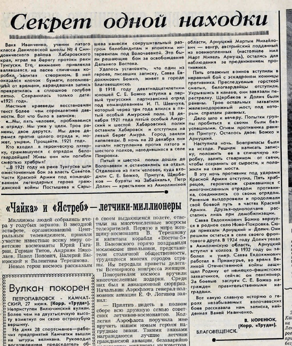 И в этом материале снова упоминается тот самый спичечный коробок, найденный однажды возле села Даниловки. Об этой находке Кудиш написал сразу в несколько дальневосточных газет в надежде хоть что-нибудь узнать о ком-нибудь из пятерых храбрецов. И вот из Благовещенска в адрес Смидовичского музея поступила бандероль. Персональный пенсионер Савва Евдокимович Божко, руководитель той самой пятерки, прислал подробный рассказ о том, как и почему было написано это письмо, и назвал имена своих товарищей.