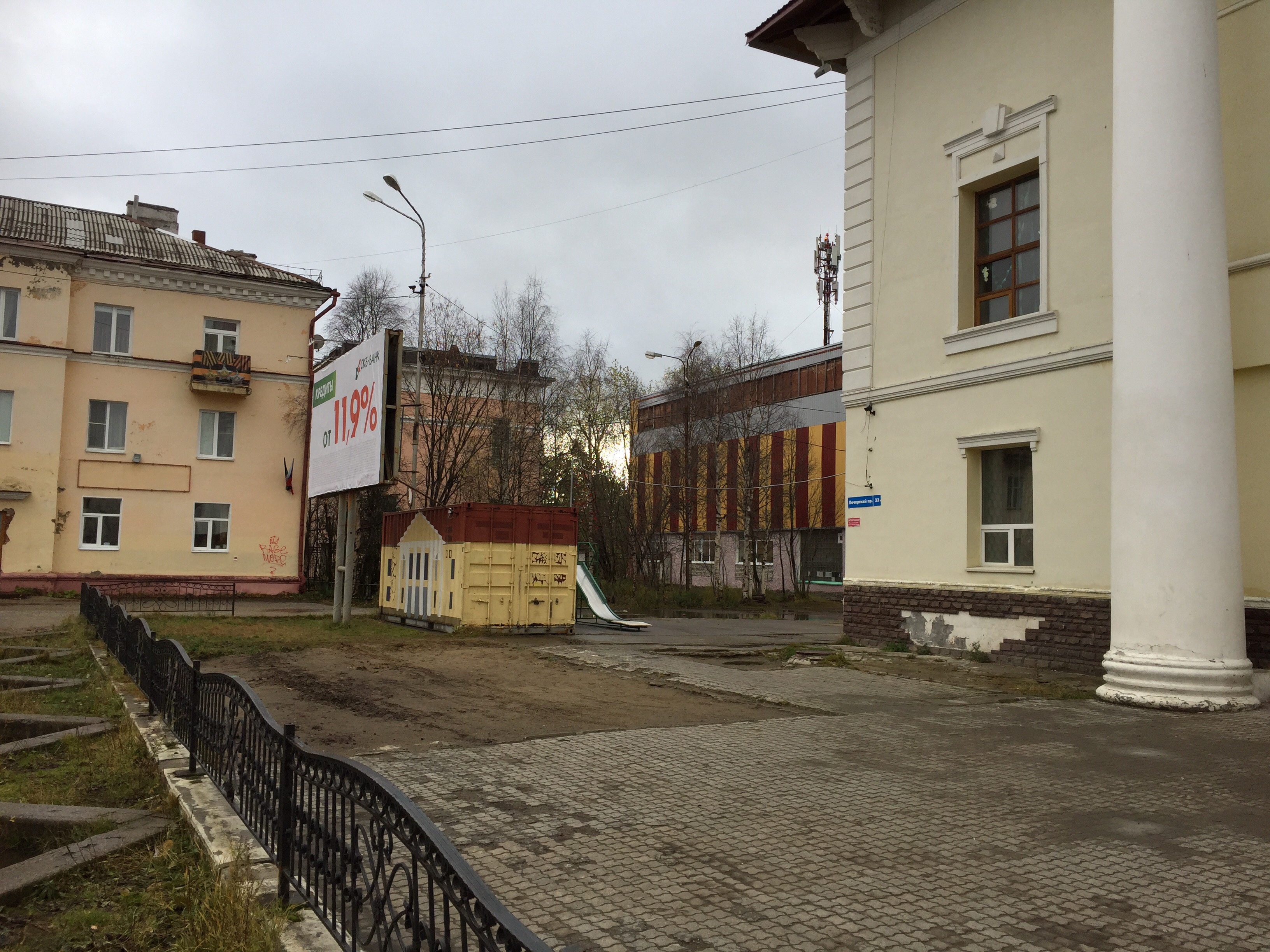 В Печоре очень много магазинов, между которыми снуют серые люди в черных куртках. Даже в Клубе речников, который белыми колоннами приковывает взгляд, разместились мясной магазин, зооуголок с енотами, лавка с мороженым, город развлечений для малышей и фитнес-зал, не считая мелких лавочек. Как правило, в таких зданиях обосновываются Дома культуры, храня верность традициям коренных народов и развлечению жителей города в национальные праздники. Рядом – контейнер с уменьшенной копией Клуба речников и говорящей рекламой на банере. Выше – полуразрушенные балконы домов, наспех затянутые банерами к 9 мая. О капитальном ремонте здесь не слышали.