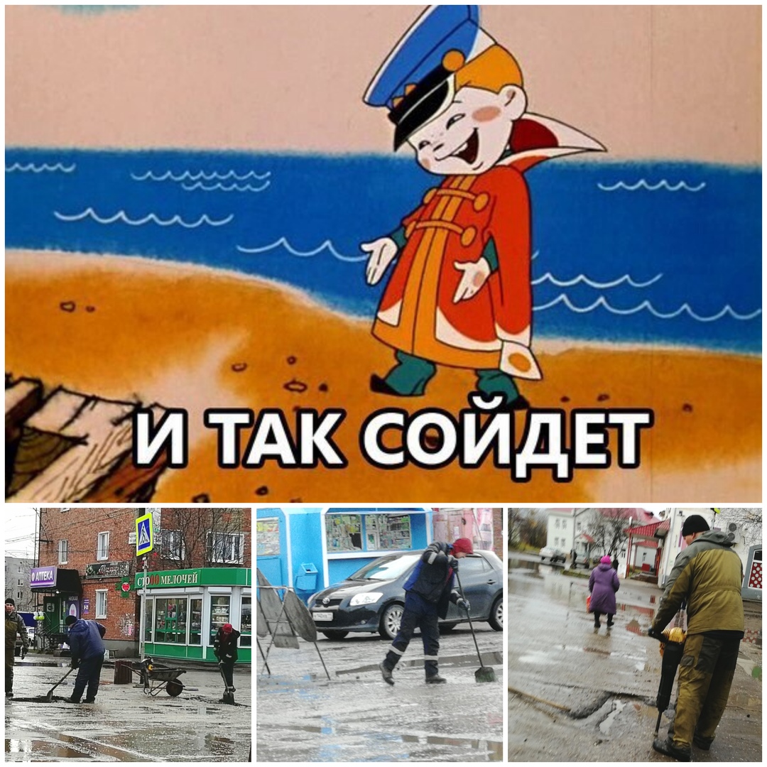 На глазах жителей города холодный асфальт укладывают в лужу особенно большой ямы и проходятся по ней виброплитой. Льет дождь. Рабочие, ругаясь на ливень, деловито выставляют знаки вокруг «отремонтированной» дыры в дороге. И исчезают. Это единственный ремонт, проведенный в этой части города, рассказывают проходящие мимо жители. Видимо, кого-то из больших шишек достало колеса пробивать.