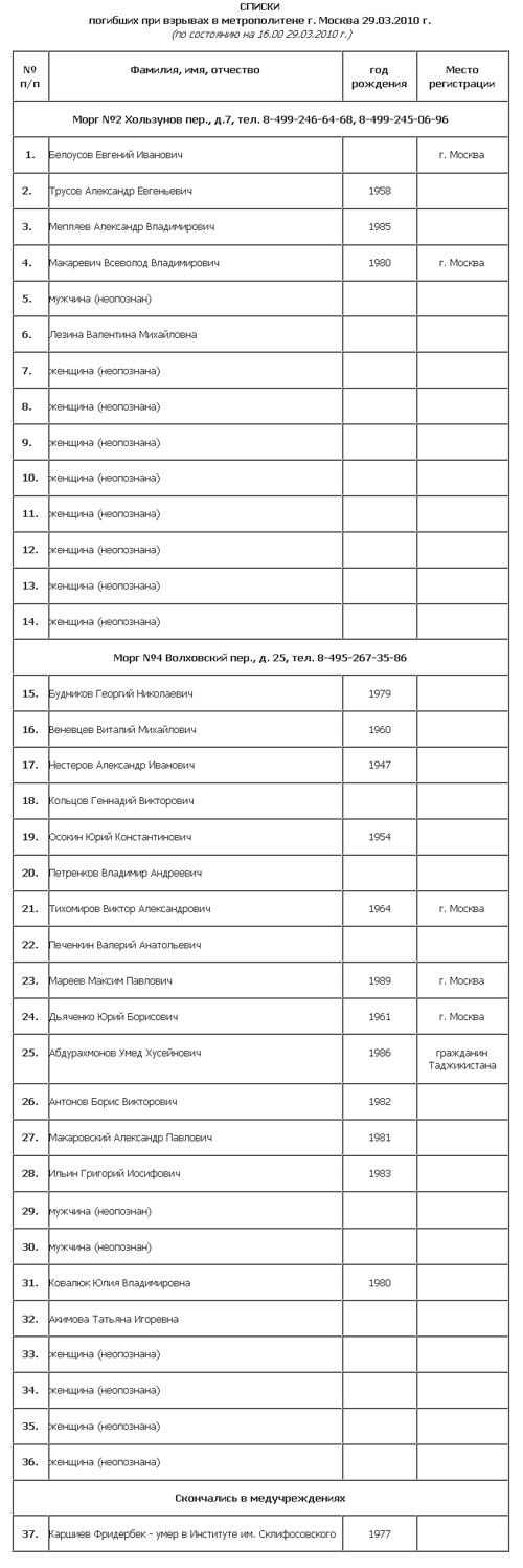 МЧС опубликовало список погибших в результате двух терактов в Московском метро.