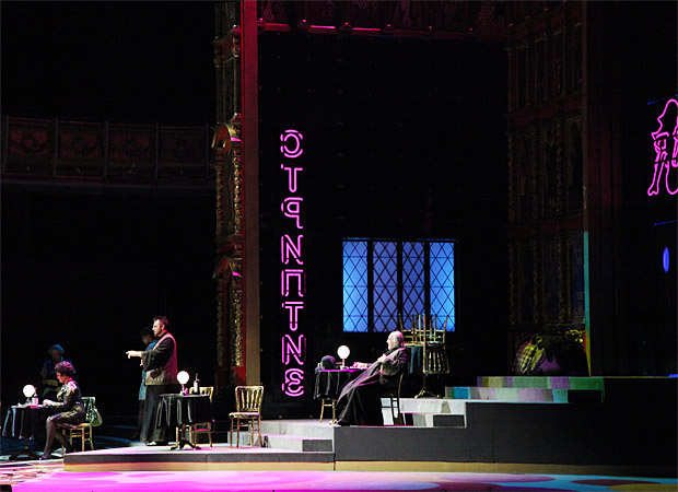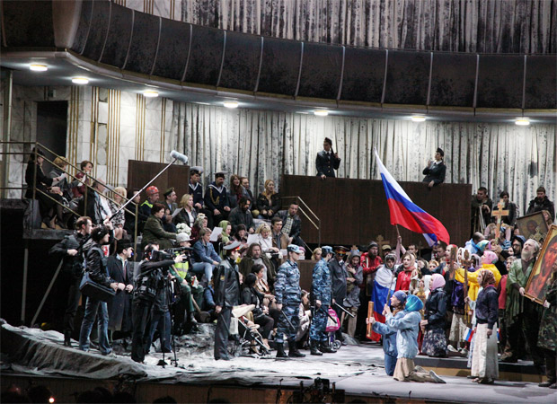 То, что предложит Вик, можно было бы угадать с закрытыми глазами: толпа на площади в современных одеждах, свирепствующий ОМОН, Борис, надевающий царскую мантию поверх серого «номенклатурного» костюма... Сейчас на Западе подобным образом ставят чуть ли не каждую русскую оперу, сюжет которой хоть каким-то образом касается общественных движений и политики: менты с дубинками и шныряющие всюду агенты в штатском стали таким же «лубком», каким раньше были пряники и ручные медведи.