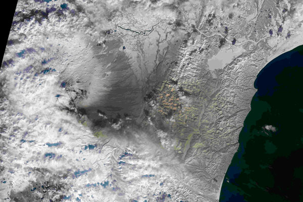 Мощное извержение вулкана произошло 11 апреля. Жители ряда окрестных поселков опубликовали в соцсетях фото и видео угольно-черного неба, с которого на снежные сугробы падает бело-серый пепел и черные куски сажи. «Роскосмос», в свою очередь, опубликовал кадры спутниковой съемки извержения вулкана Шивелуч на Камчатке. На кадрах, сделанных спутником «Электро-Л» № 4, видно, как огромный столб пепла поднимается над плотным облачным покровом, которым был закрыт полуостров.