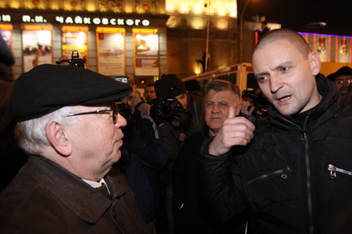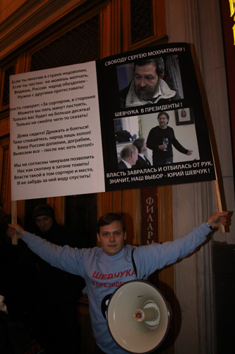 Не мудрствуя лукаво, именно так и поступили наиболее радикальные оппозиционеры, уверенные, что нельзя идти власти ни на какие уступки. Ими был поднят транспарант, призывающий освободить Сергей Мохнаткина (Мохнаткин был задержан на акции в защиту Конституции 31 декабря прошлого года и осужден на 2,5 года колонии общего режима за, якобы, «избиение сотрудника милиции»), а также с требованием избрания президентом России