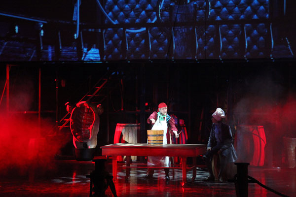 Но все же это оказался именно мюзикл. Правда, не сказать, чтобы первые сцены, где юный Джим Хокинс и его матушка еще влачат свое обыденное существование в захудалом бристольском трактире, вдохновили яркой музыкой: мелодии здесь слащаво-стерты и незапоминаемы. А вот видеоряд действительно колоритен: конечно, ни о каком 3D в привычном киношном смысле речи нет – но видеопроекции в самом деле составляют основу оформления, перенося из замшелого подвального кабачка в гостиную богатого дома, оттуда в порт, потом на корабль, на тропический остров, в заброшенный деревянный форт в джунглях… Словом, вся стивенсоновская романтика оживает в подвижных картинах, придуманных знаменитым художником-постановщиком Вячеславом Окуневым.