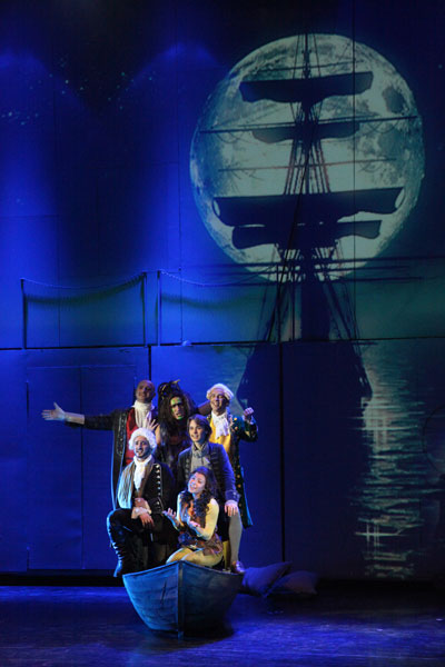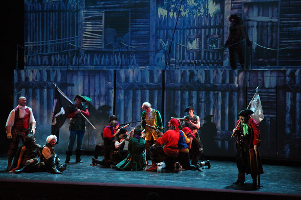 Волей режиссера Аркадия Гевондова актеры не только активно осваивают двухъярусную сцену, но и периодически взлетают в сценическое поднебесье (например, на подъемных люстрах в дуэте главных героев из первого действия), так что глазу зрителя некогда соскучиться. Что до самого актерского исполнения, то, пожалуй, все же не на долю главной пары выпал основной успех: образы, которые предложены Алексею Байкову и Анне Игошиной, слишком уж дежурно-положительны, а яркого вокала не продемонстрировали ни он, ни она. Зато энтузиазм и взрослых, и детей вызвали зловещий одноногий хрипун Сильвер (Вадим Карев), потешный, как говорящая обезьяна, Бен Ганн (Геннадий Папиж-Ткаченко) и вся забавно-злодейская пиратская братия.